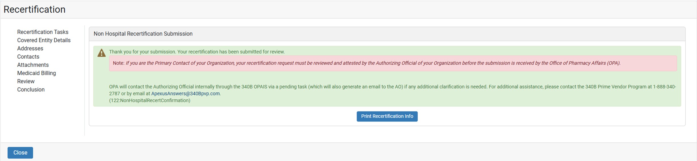 Click this button to submit the recertification for OPA approval.