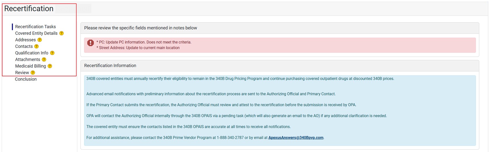 If you are recertifying a CH or FQHCLA entity, where the entity is no longer “active” in EHBs, which is a requirement for 340B participation, there will be a warning displayed on the Recertification Summary with the actions that need to be taken to update the information.