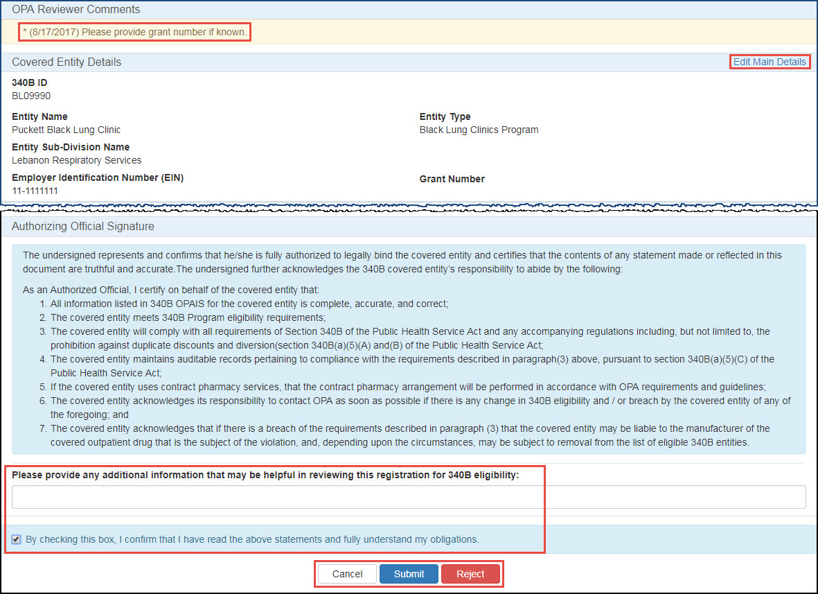 If OPA determines that a registration, reinstatement, or a change request submission has issues that need to be resolved, OPA may send it back to the Covered Entity for correction. This will create a resubmission task for the AO and the
