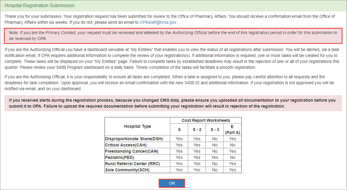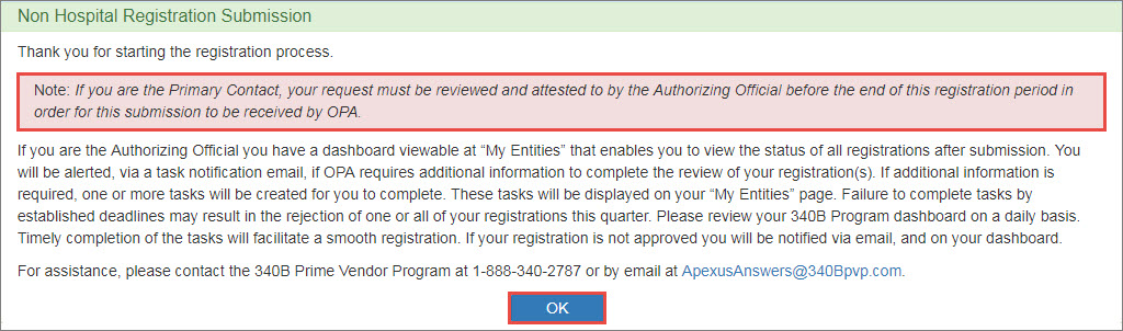 OPA will review the registration and notify you when the registration is approved. OPA may request more information to verify eligibility. Once the registration is approved, the entity's enrollment in the 340B program will start on the first day of the next quarter.