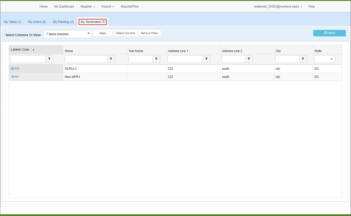 The My Terminated tab of My Dashboard lists the Labeler Codes to which the user is associated that are Terminated.